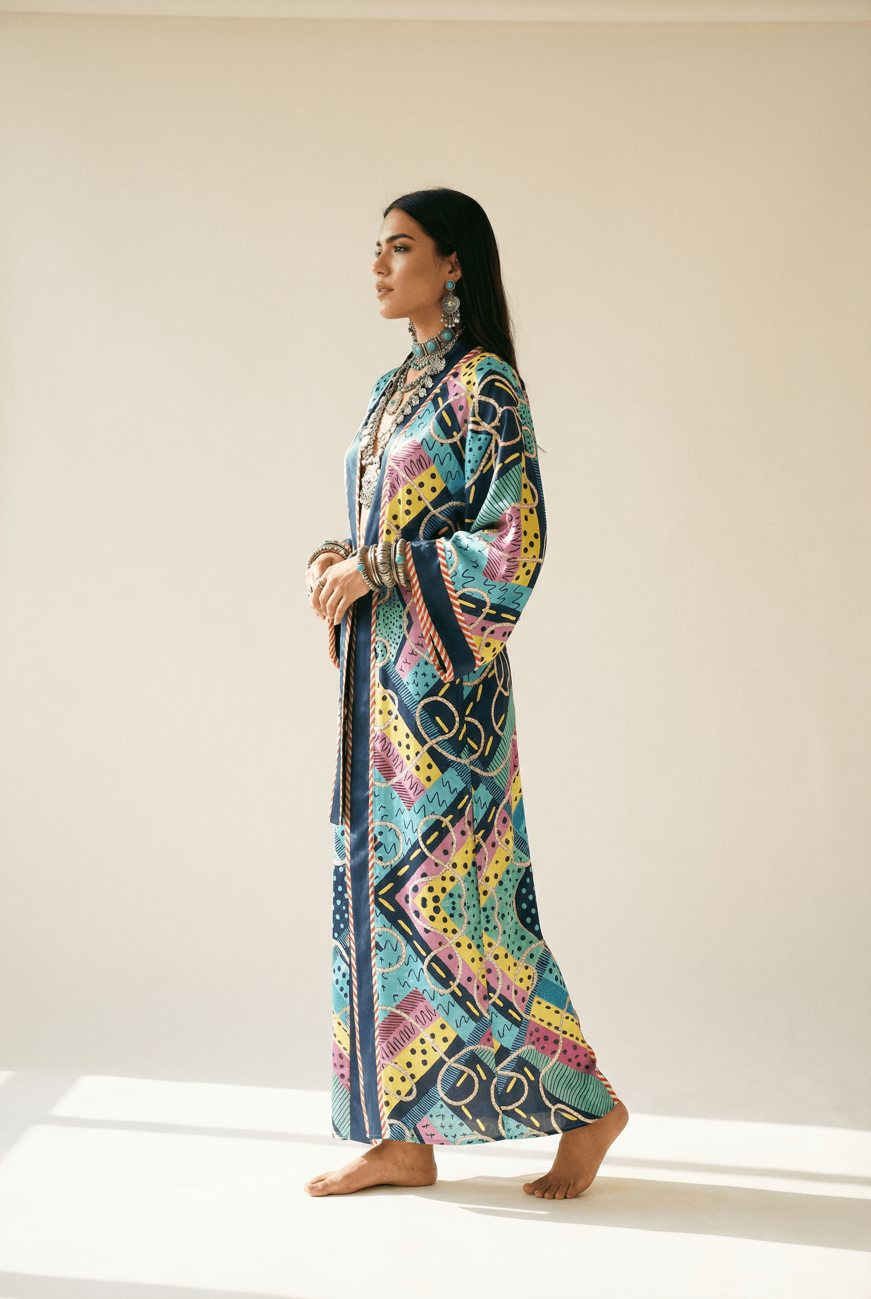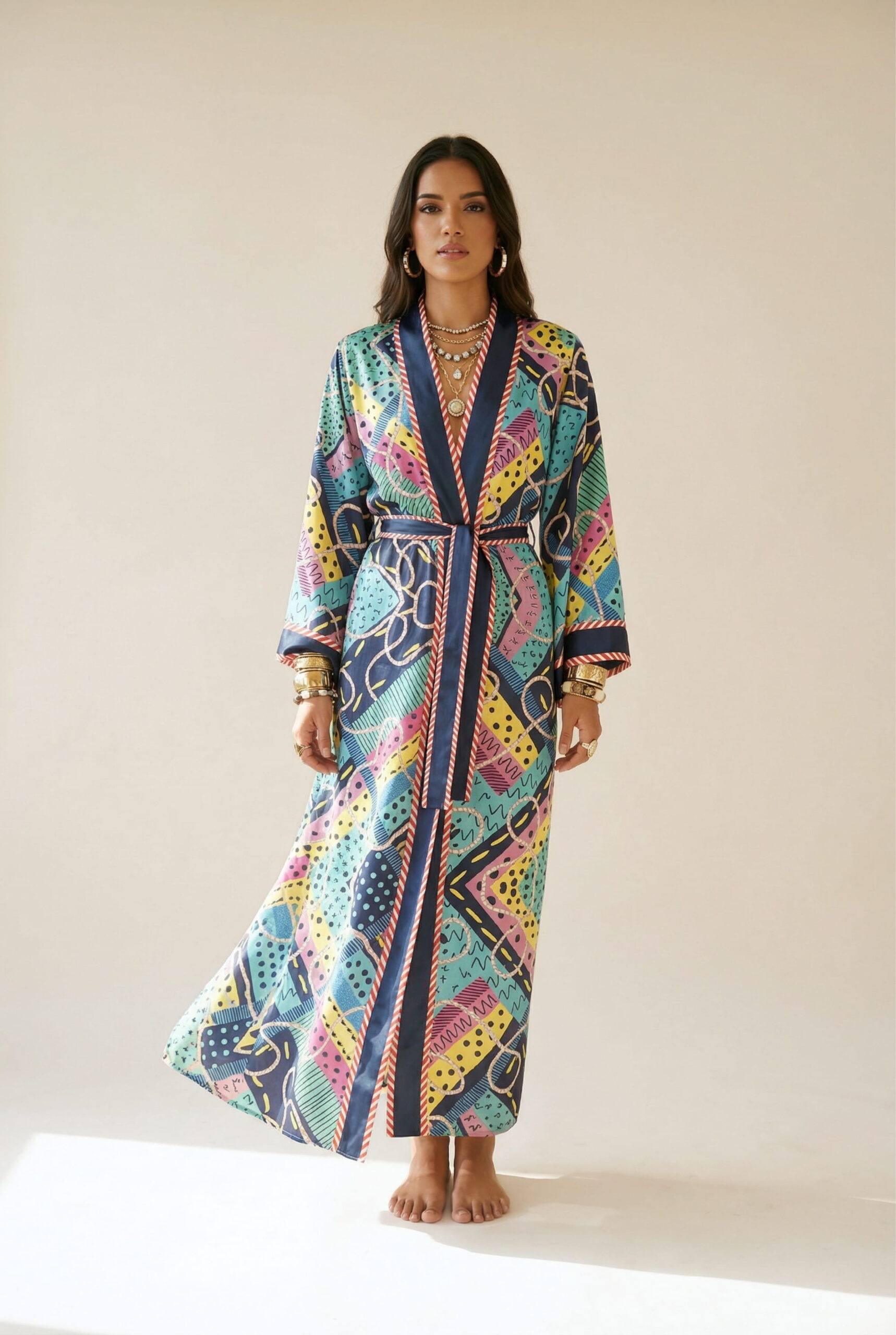 A vivacious silk robe designed for the woman who sees life as her canvas. Bursting with energy and attitude, this full-length statement piece features a dynamic interplay of abstract motifs: playful crosses, wavy lines, bold dots, and striking geometric shapes, all intertwined with a whimsical rope pattern. The color palette? A fearless fusion of turquoise, fuchsia, lemon, and pink that radiates creativity and confidence. Crafted from 100% silk with a fluid, lustrous drape, Ada is finished with a boldly striped belt that draws the eye and cinches the waist